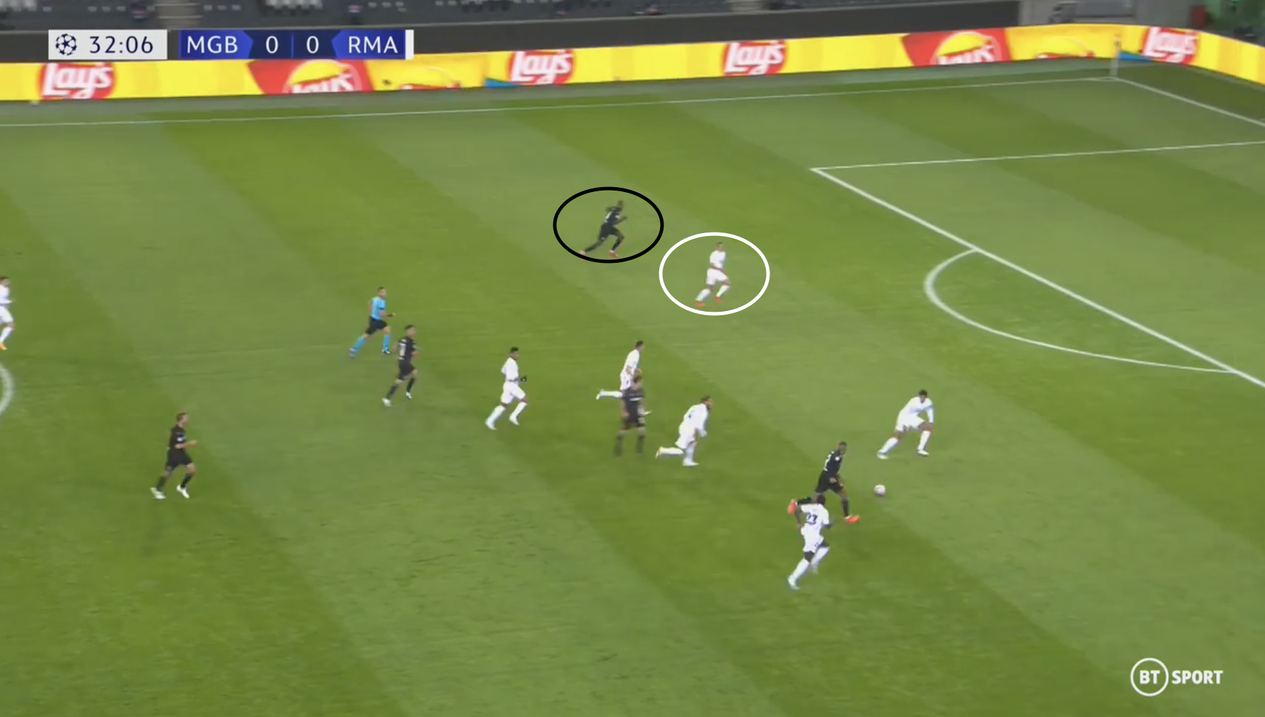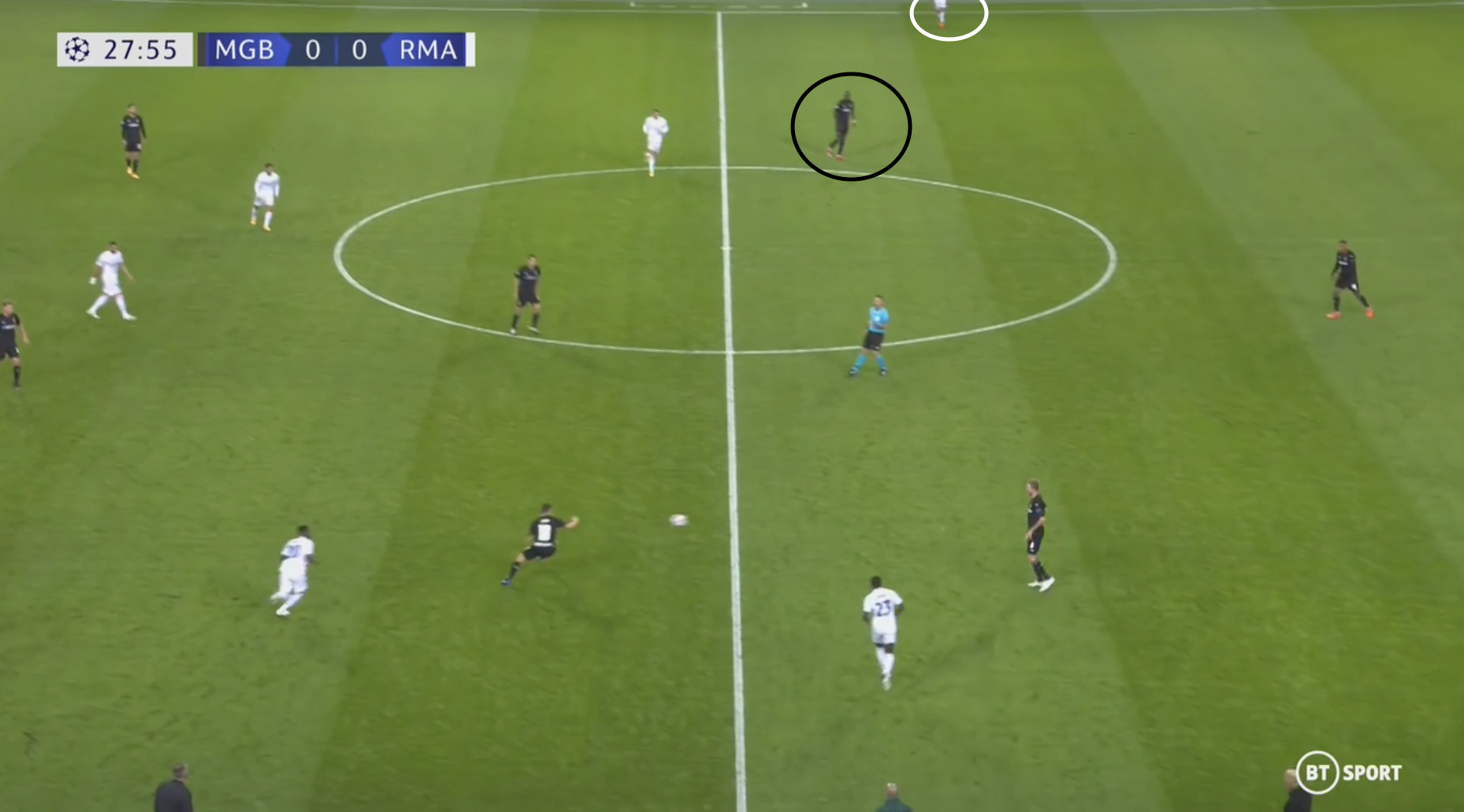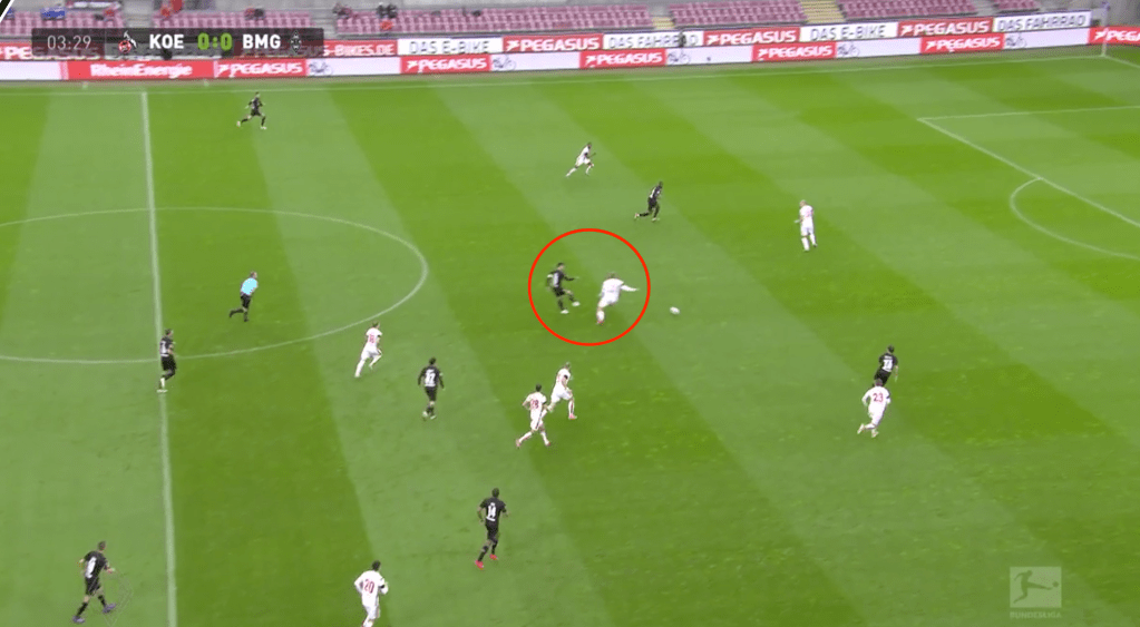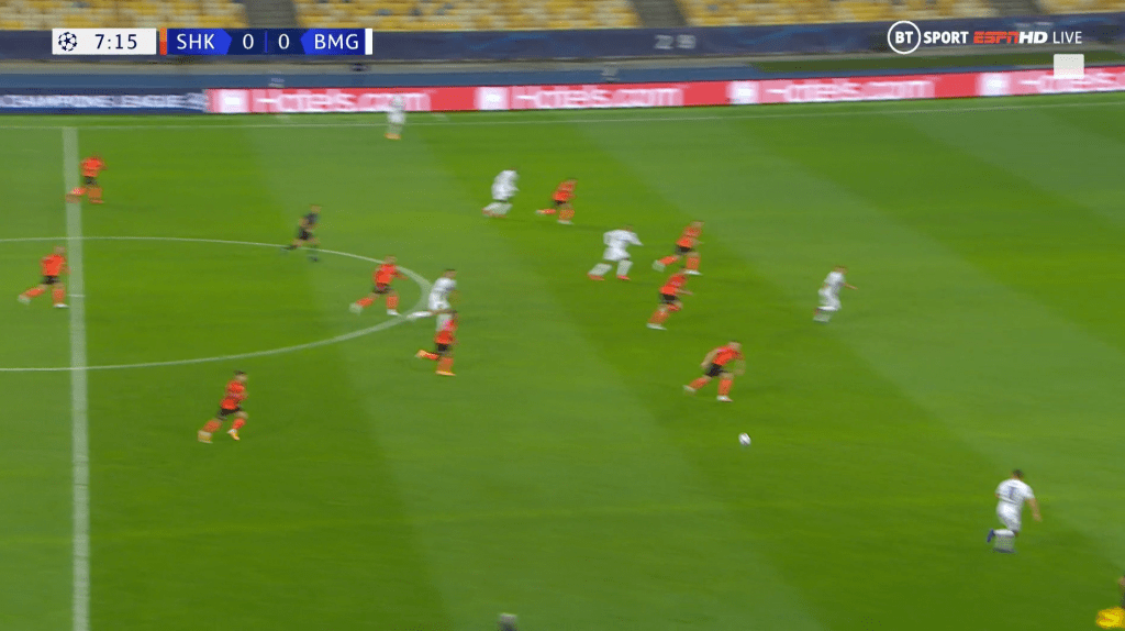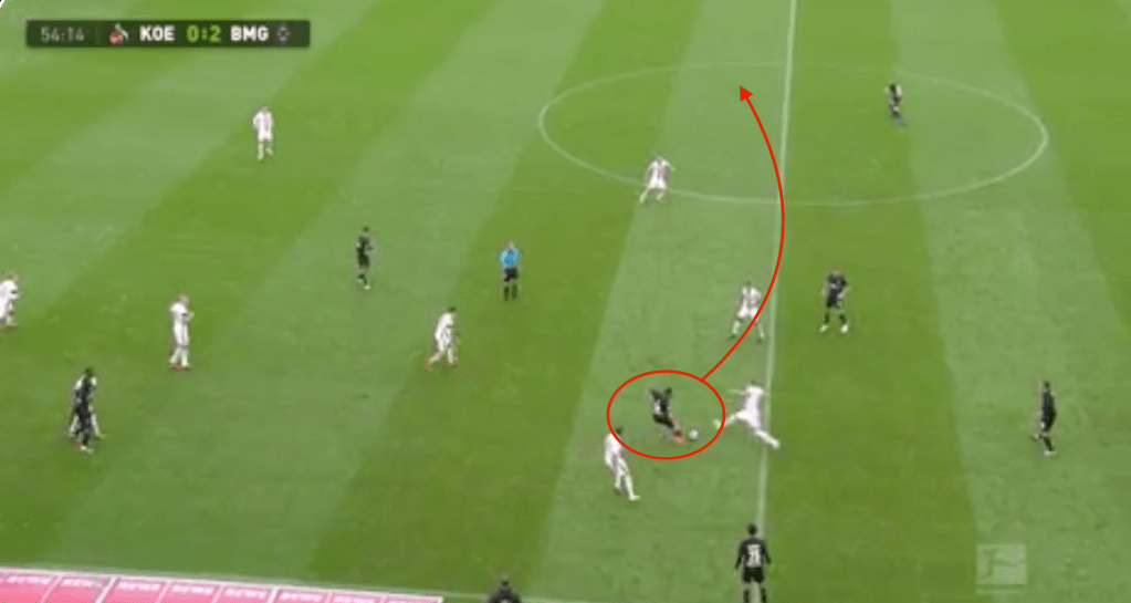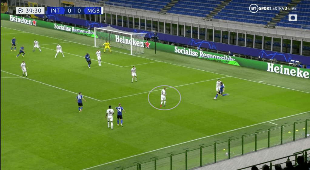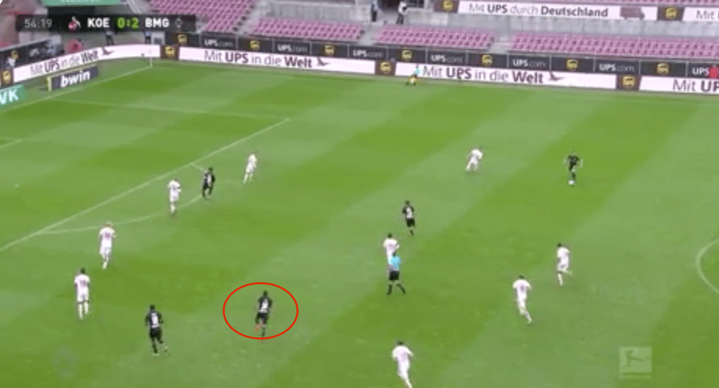 That means he can spend a lot of time positioned higher up the pitch, in the left-wing slot, and Gladbach still maintain a compact defensive shape, all thanks to his defensive work-rate.