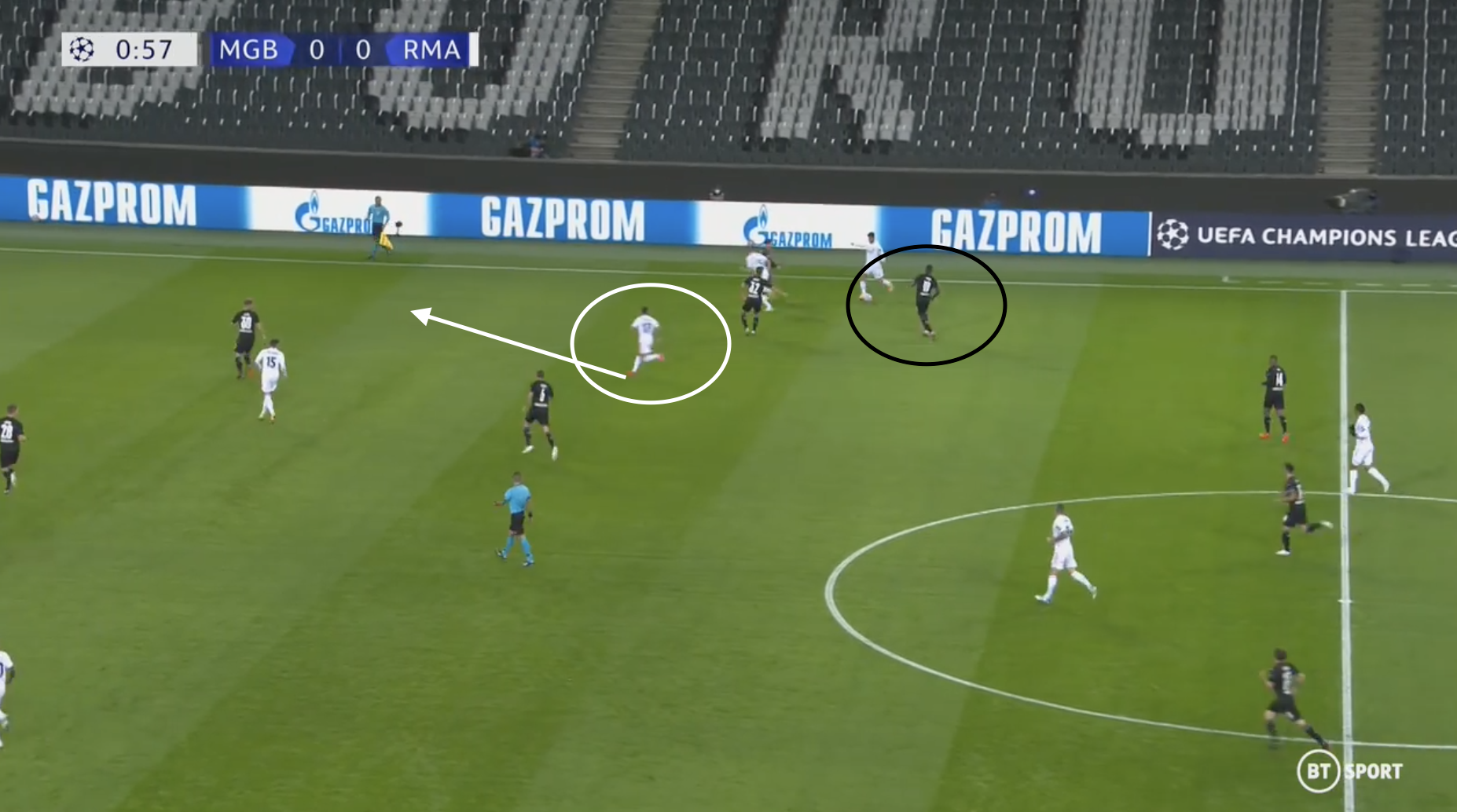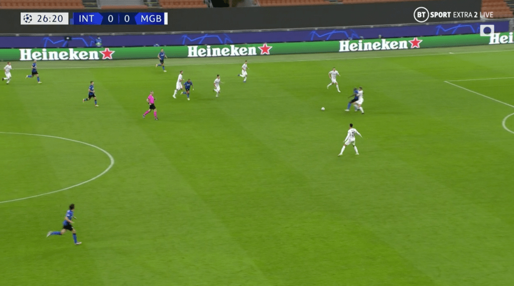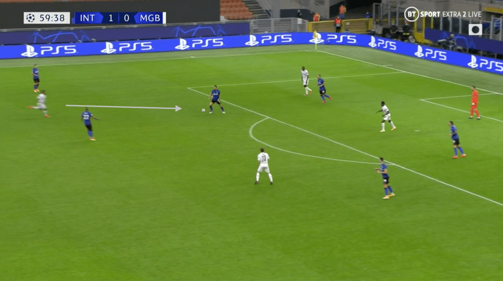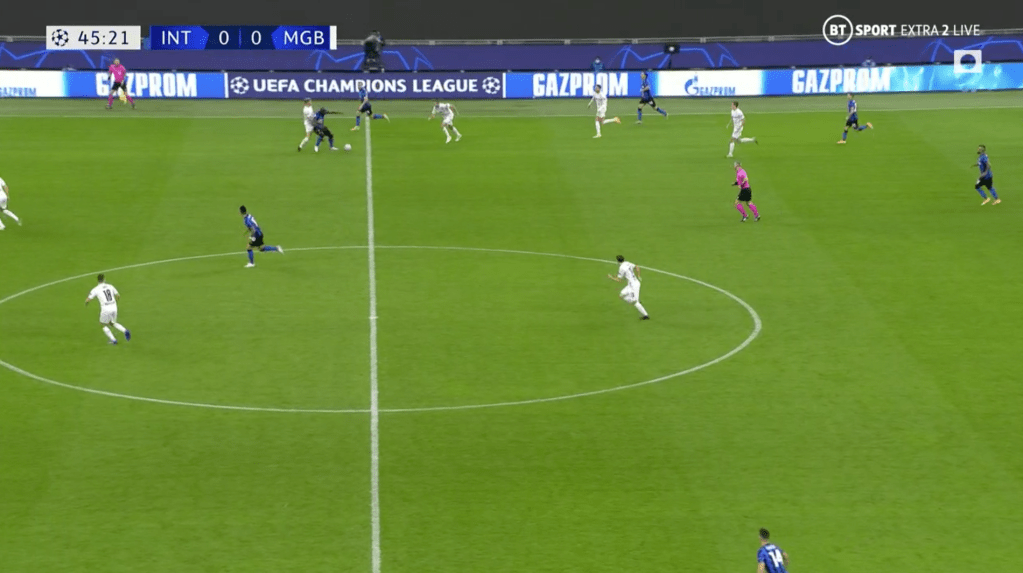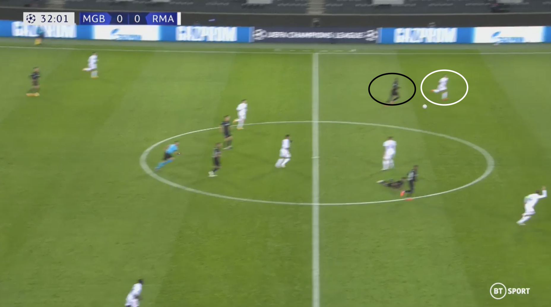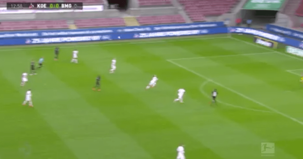 That means he can spend a lot of time positioned higher up the pitch, in the left-wing slot, and Gladbach still maintain a compact defensive shape, all thanks to his defensive work-rate.