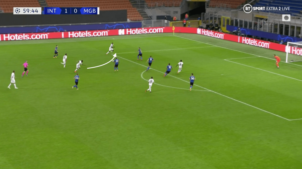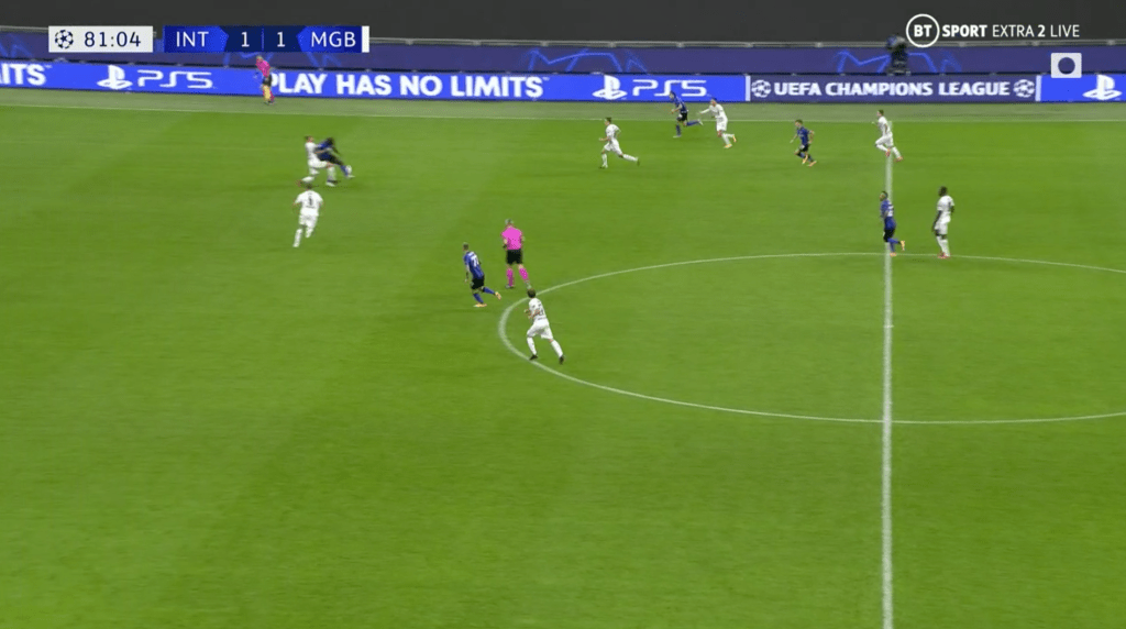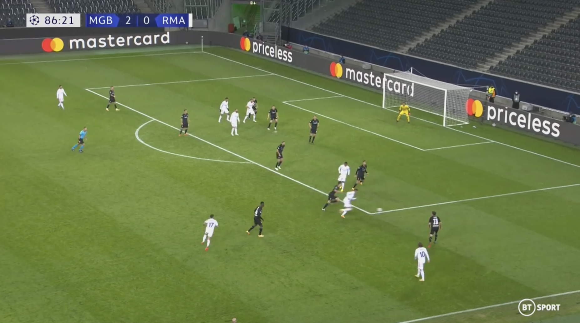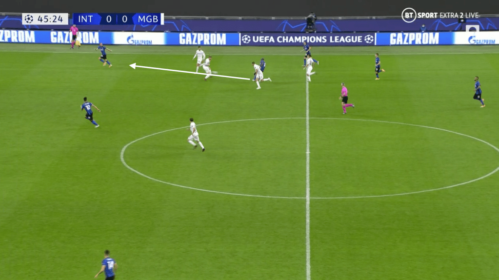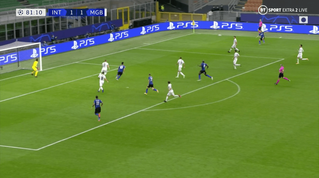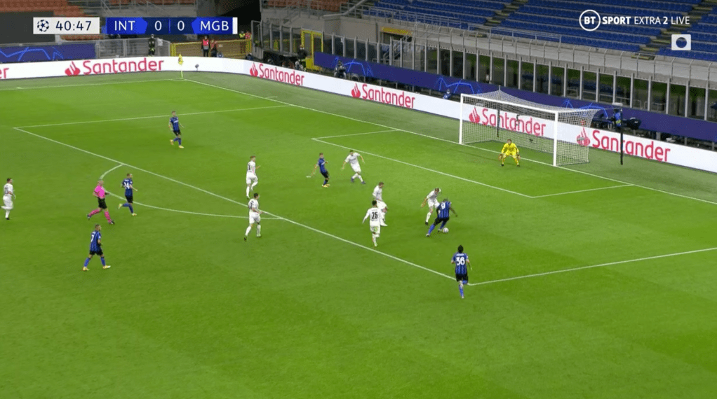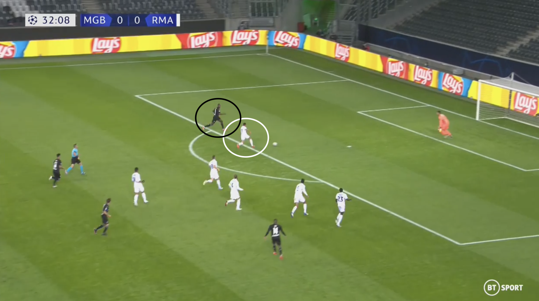 That means he can spend a lot of time positioned higher up the pitch, in the left-wing slot, and Gladbach still maintain a compact defensive shape, all thanks to his defensive work-rate.