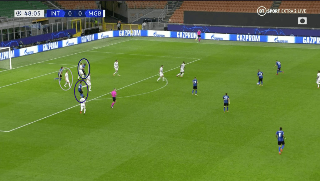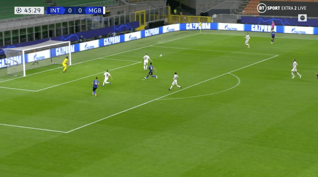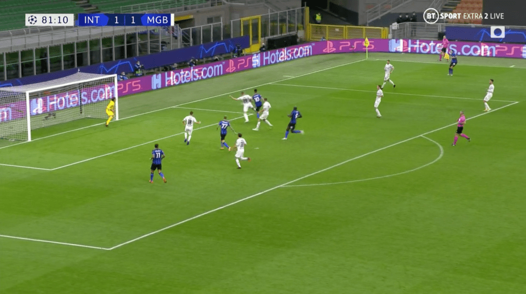 Pavard instead chips a poor quality ball to Sane, and Bensebaini completes his part of the press, forcing a turnover. Hofmann then shows the other side of his game, working the ball well with Neuhaus and then getting on his bike to exploit the left channel, blazing past the flat-footed Süle, taking the lovely ball from Stindl and slotting home.