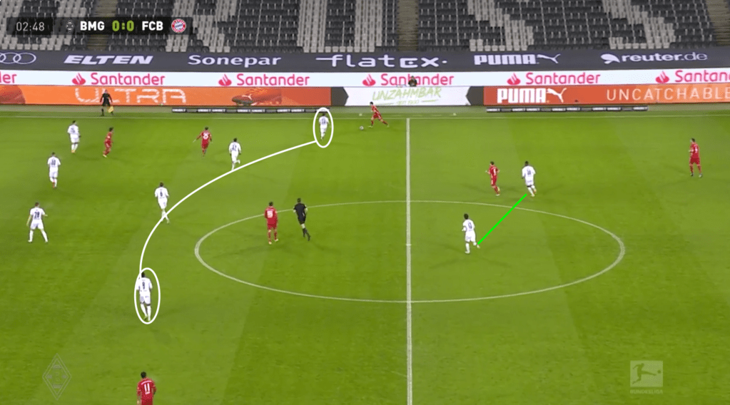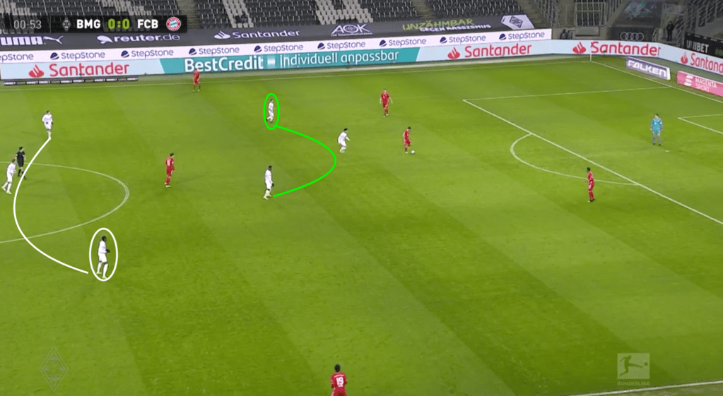 Gladbach’s set-up did often leave space on their left flank, in behind Hofmann, and thus would leave Pavard free, at least for a moment. That made Pavard the more natural out-ball, compared to Davies, who always had Zakaria in front of him. Gladbach bet that by leaving Pavard free, they could channel play his direction. Of all Bayern’s players, he was the least likely to cause them problems, and even if he had a little time on the ball, it was never long, thanks to Hofmann’s backwards pressing.