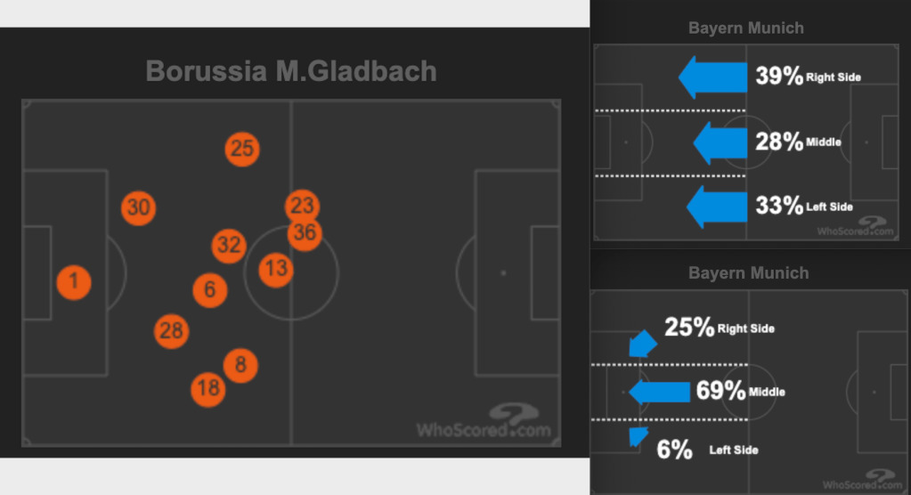Firstly, unless Gladbach’s tactics forced the ball out towards Pavard, Bayern likely would have directed more play out towards Davies, and probably threatened more often from the left. As it was, Stevie Lainer (18) and Zakaria (8) were close together, and clogging up that flank, compared to Ramy Bensebaini (25), who, on the face of it, had to cover more space by himself (until Hofmann made up the ground to help out). As such, Bayern directed more play down the right, as you can see. (Thanks WhoScored for these graphics. Gladbach player’s average position is on the left. On the right, Bayern’s attack sides are on top, with shot directions on the bottom)