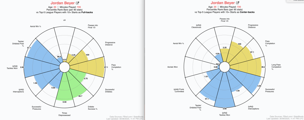 Jordan Beyer is a defender who can play on the right or in the centre of defence. Pretty quick and good on the ball, he is a reliable tackler who can also pass. The ambiguity over his best position mainly stems from the fact he isn’t great in the air for a centre-back, but doesn’t offer too much creativity going forward as a full-back.