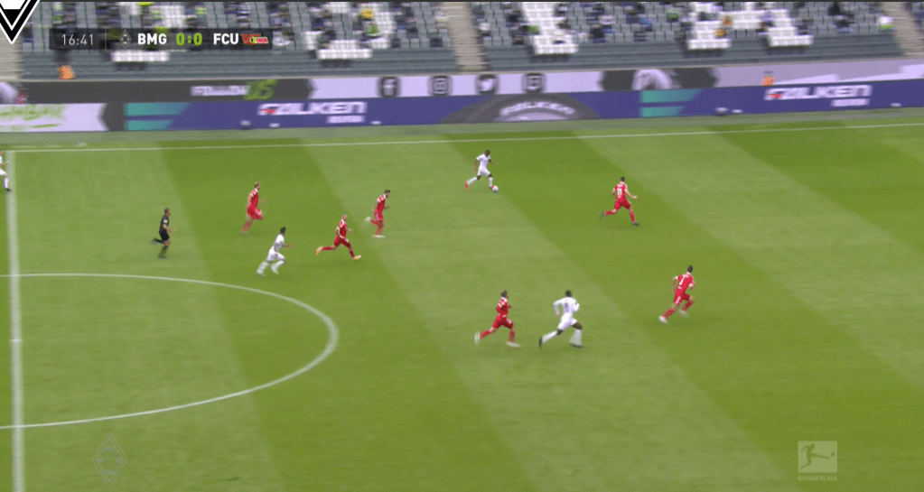 Most fans, when asked about their dream, full-strength XI, have some combination of Hannes Wolf, Breel Embolo, Thuram and maybe Lars Stindl compromising an attacking midfield three in support of Pléa. As such, it might be with some surprise that with a reversion to 4-2-3-1, Wolf was dropped and Thuram played on the right, with Hofmann operating on the left. It seemed like Wolf could cut in from the right, with Thuram cutting in from the left, for a full throttle attack.